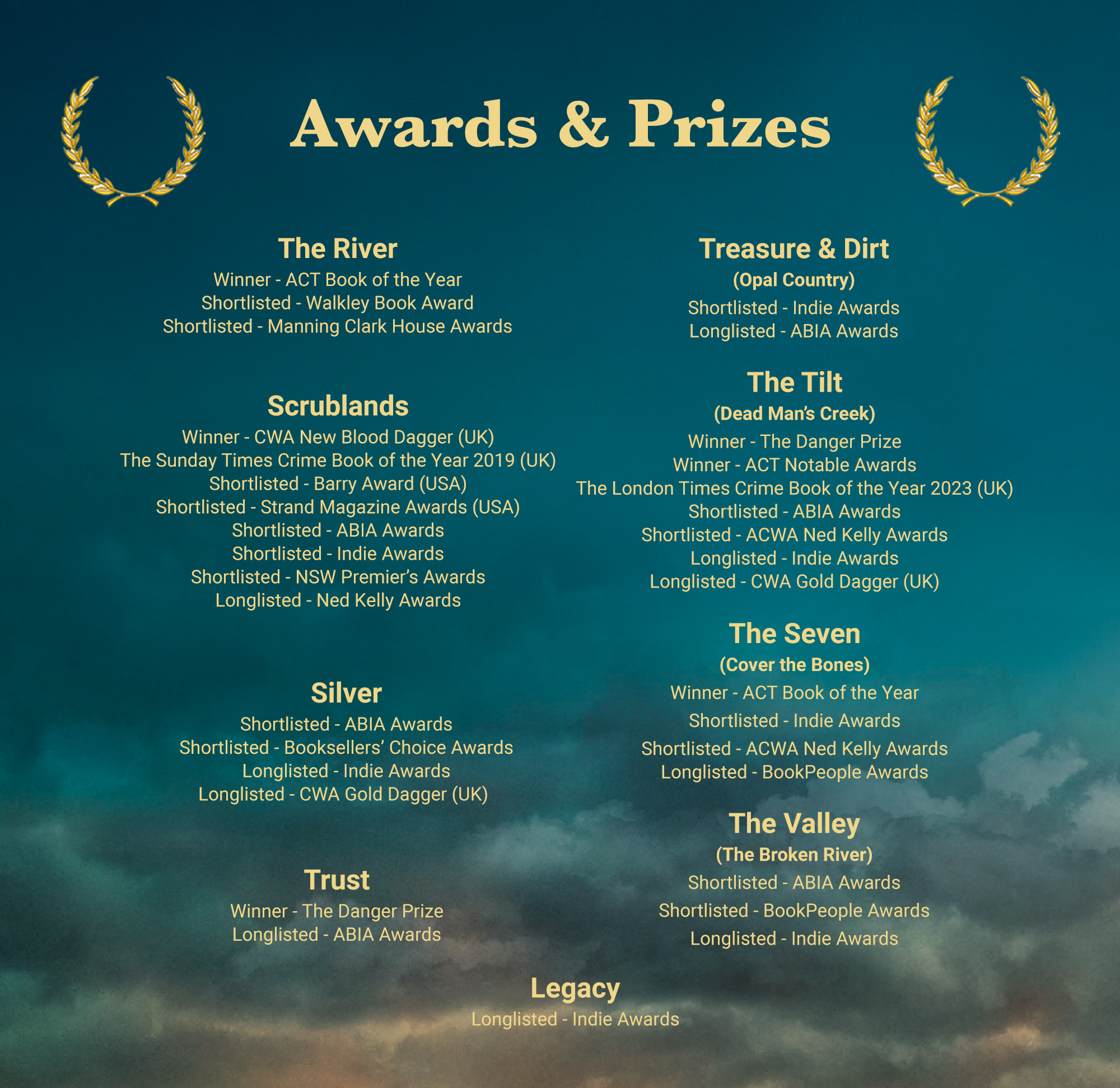 Treasure & Dirt (2021), The Tilt (2022), The Seven (2023) and The Valley (2024) are all set in the dramatic landscapes of Australia, and can be read as a series or as stand-alone novels.